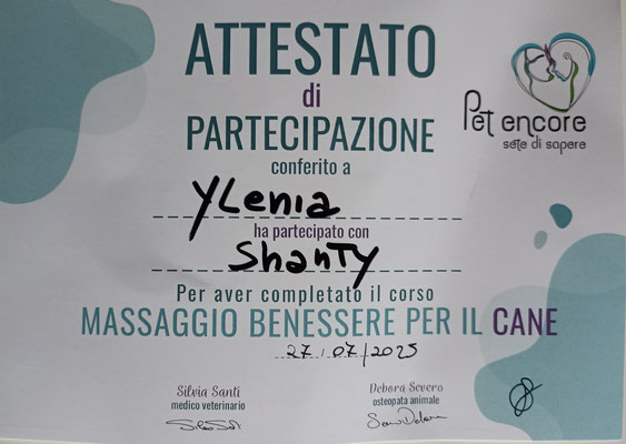 "Tecnico puppy-road" (tradotto, insegnante per la corretta gestione dei cuccioli e della mamma dalla nascita alla consegna) e a questo ci tengo in particolar modo perché l'ho ottenuto lavorando tanto, non solo su me stessa e la nuova "mentalità" cognitiva, ma perché gli altri educatori hanno visto questo in me.